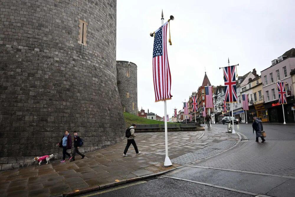 这是 9 月 17 日在英国伦敦近郊的温莎城堡外拍摄的美国国旗和英国国旗。新华社 / 法新