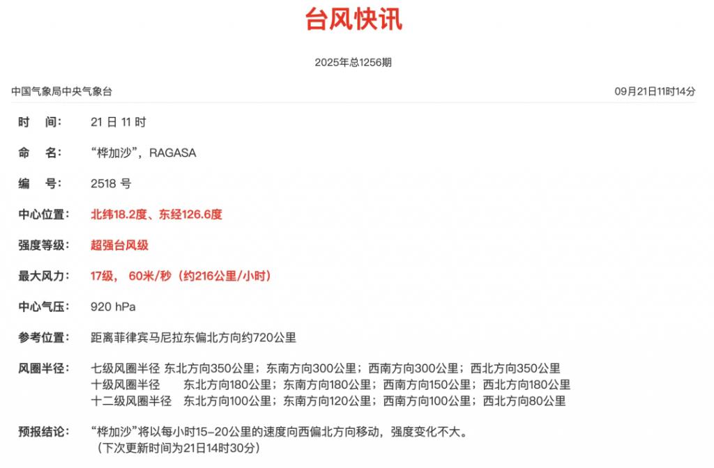 9 月 21 日 11 时,中央气象台台风快讯显示," 桦加沙 " 已加强至中心附近最大风力 17 级的超强台风