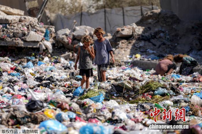 当地时间 2024 年 8 月 29 日,在加沙地带中部,孩子们走在垃圾堆上。