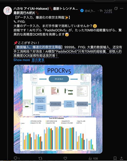 过去的一段时间里,和霸榜成绩接连出现的是一系列针对 PP-OCRv5 的海内外 " 自来水 " 评价,比如 Gizchina.com 锐评 "百度的 PP-OCRv5 表明,小型号仍然可以发光 ",比如再比如来自一系列网友的称赞,如 "データ入力、爆速化の救世主降臨✨ " ( " 数据录入,极限提速的救世主降临✨ " ) 、" 圧倒的性能でAIモデル「PaddleOCRv5」が、たった70MBの超軽量ながら、驚異的な高精度 OCR 技術を実装します" ( AI 模型「PaddleOCRv5」以压倒性的性能,在仅 70MB 的超轻量体积下,实现了惊人的高精度 OCR 技术 ) 等等屡见不鲜。