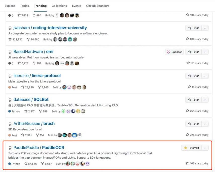 此外,在 9 月 18 日,在 PP-OCRv5 的热度加持下,PaddleOCR 项目也更登上了 GitHub 全球总榜 trending 榜。