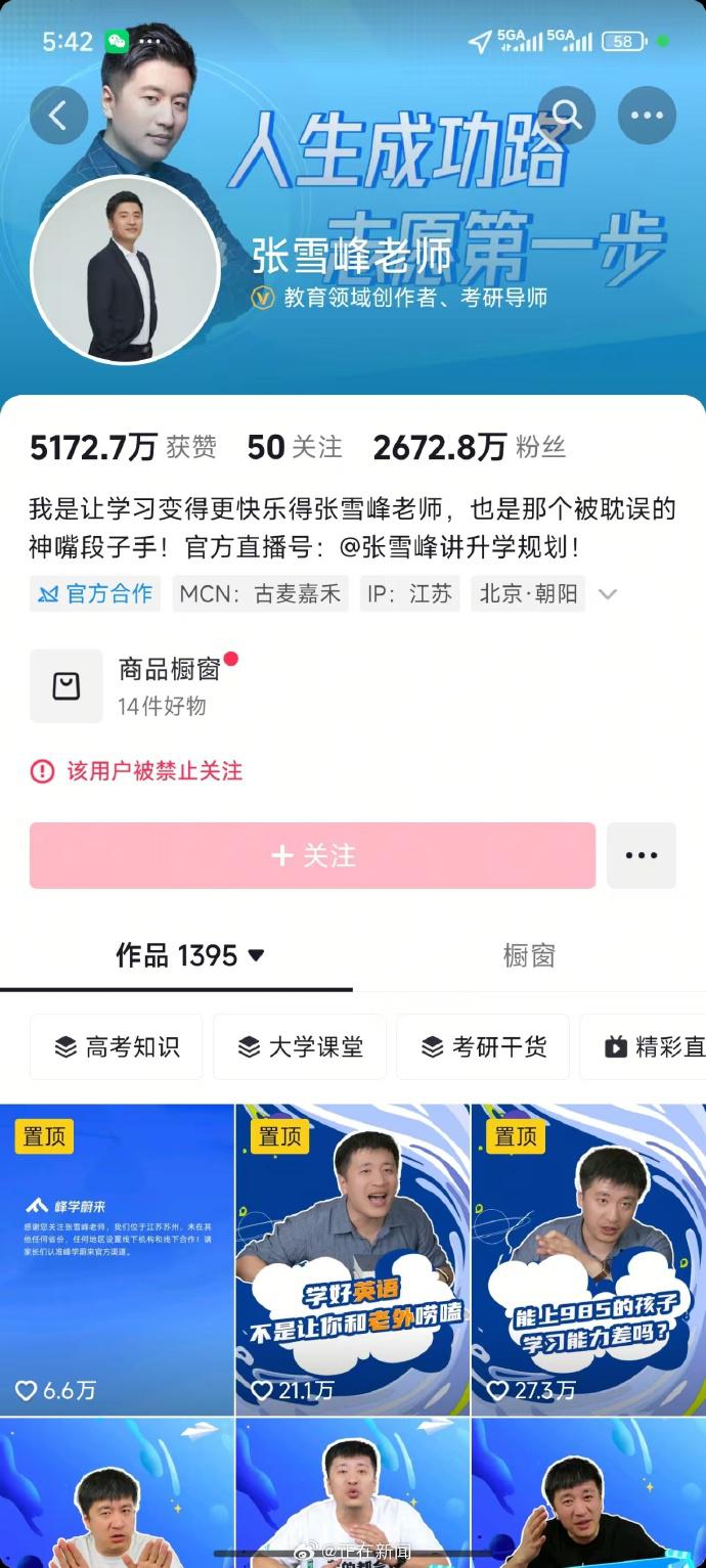 张雪峰多个社媒账号被禁止关注 包括微博、抖音、小红书等