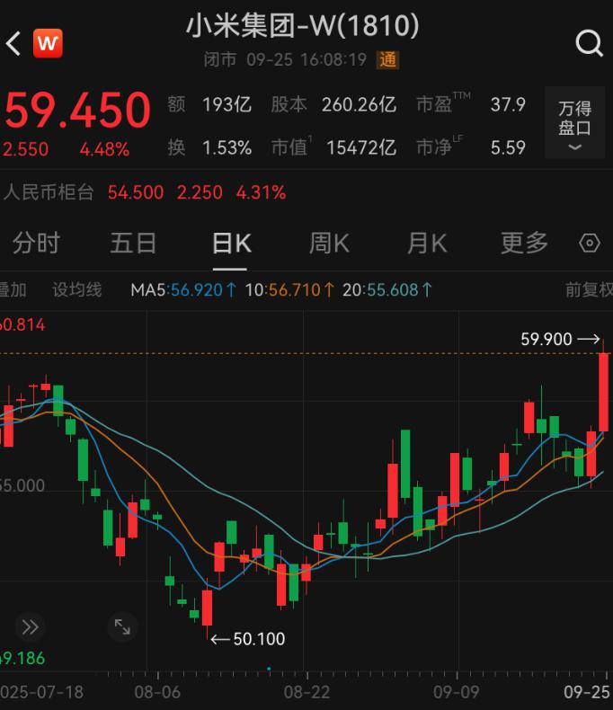 值得注意的是,9 月 25 日午后,小米集团股价大幅拉升,收涨 4.48%,每股报 59.45 港元,总市值 1.55 万亿港元。