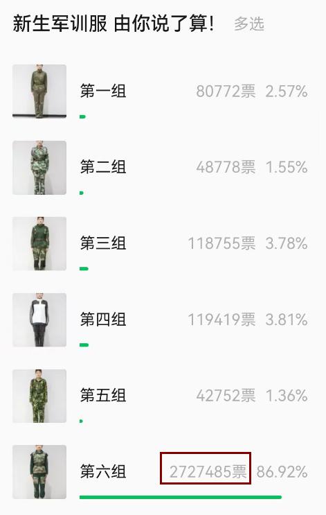 今年 5 月,山东轻工职业学院推出了军训服投票活动,6 套衣服里选一套。