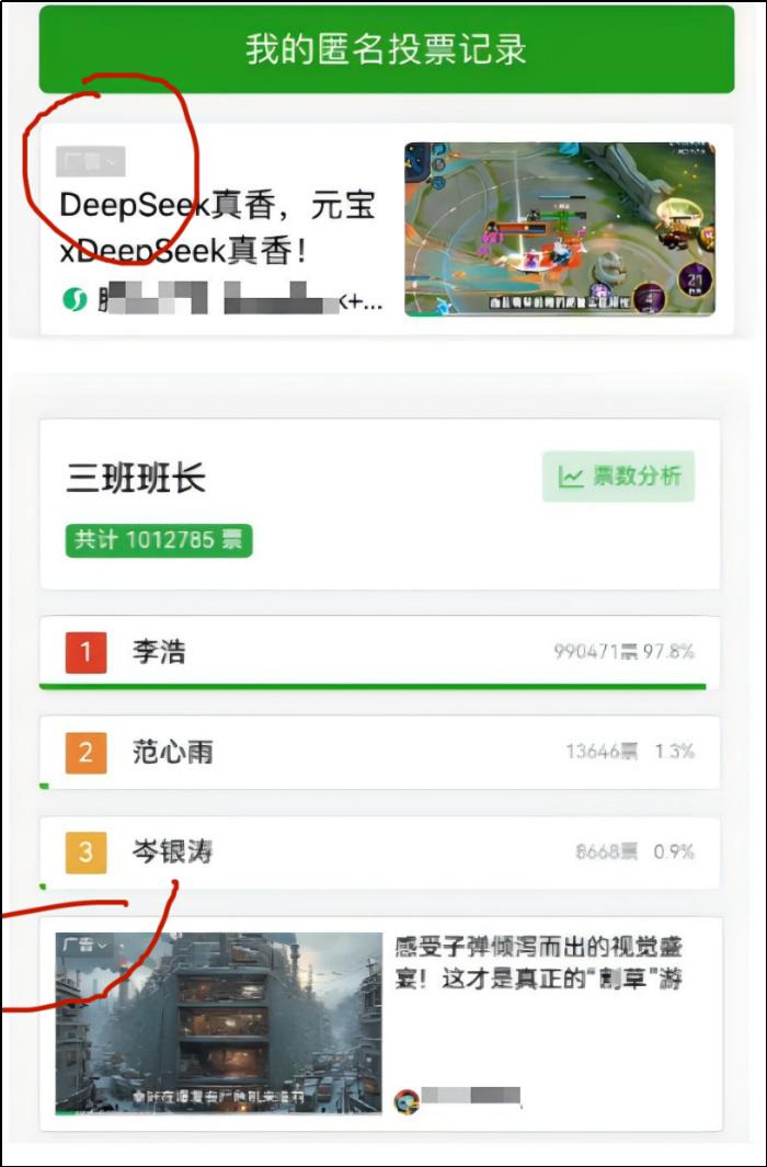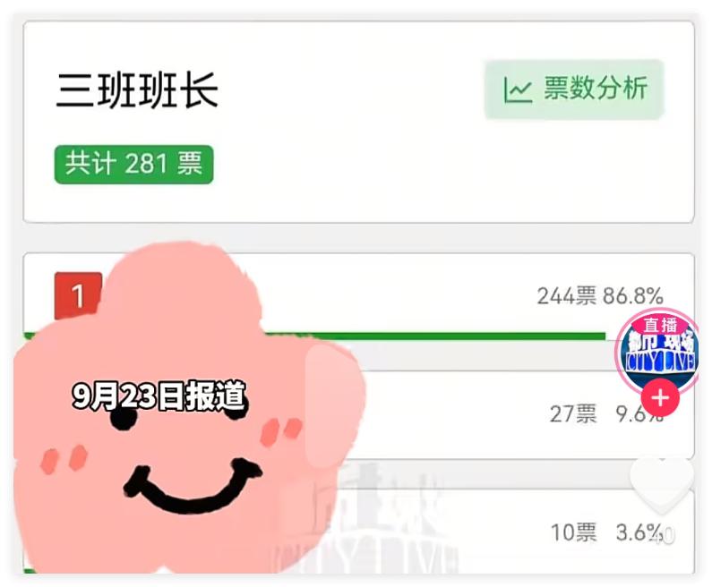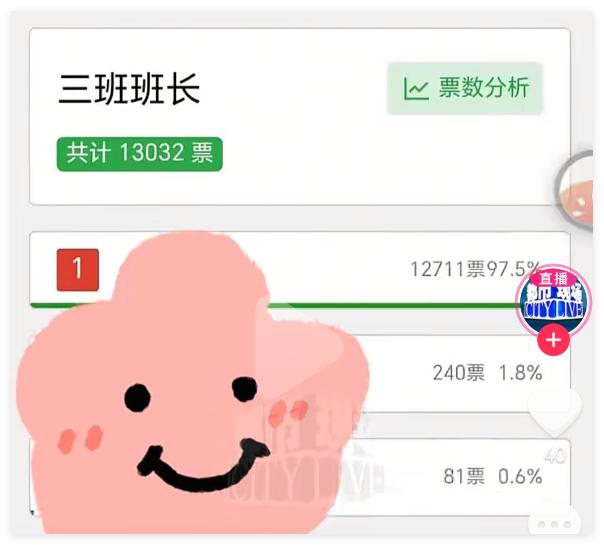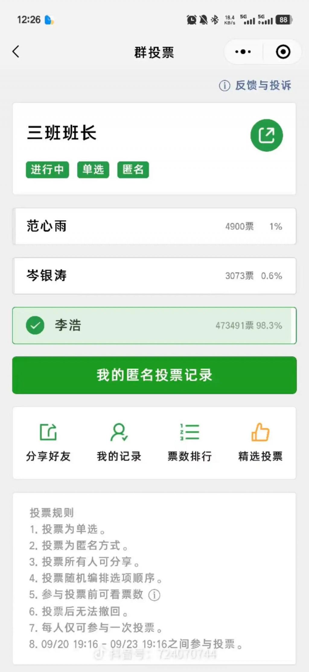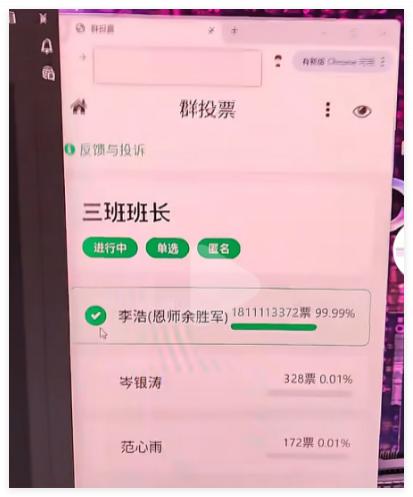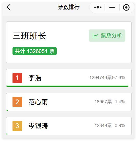最终结果,李浩以 1294746 票的绝对优势当选三班班长。