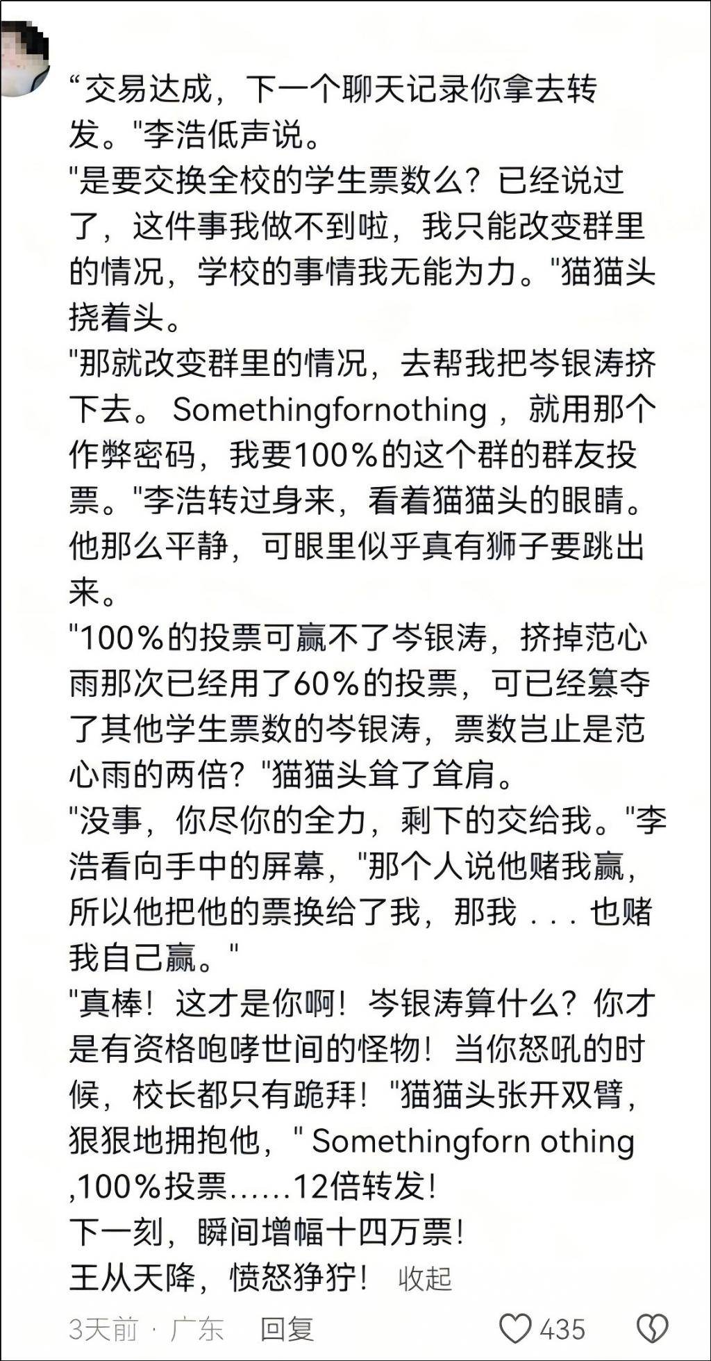 可能很多人觉得拉票的源头是给李浩帮忙,所以他一路领先。其实哪怕一开始是给范同学岑同学拉票,最后还是李浩赢。
