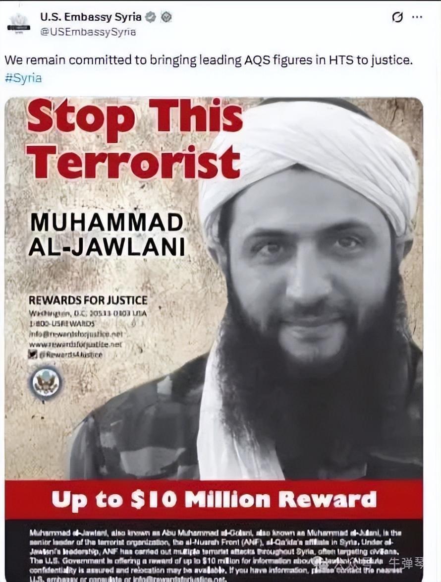 因为他当时还叫朱拉尼,他曾是叙利亚 " 基地组织 " 创始人,他还一度加入过 " 伊斯兰国 ",他双手沾染过很多美国人的血。