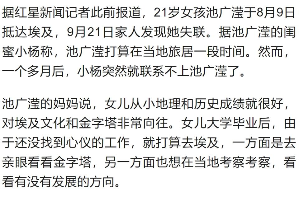 9 月 26 日晚,红星新闻报道了中国女孩池广滢独自赴埃及旅行失联的消息,引发关注。