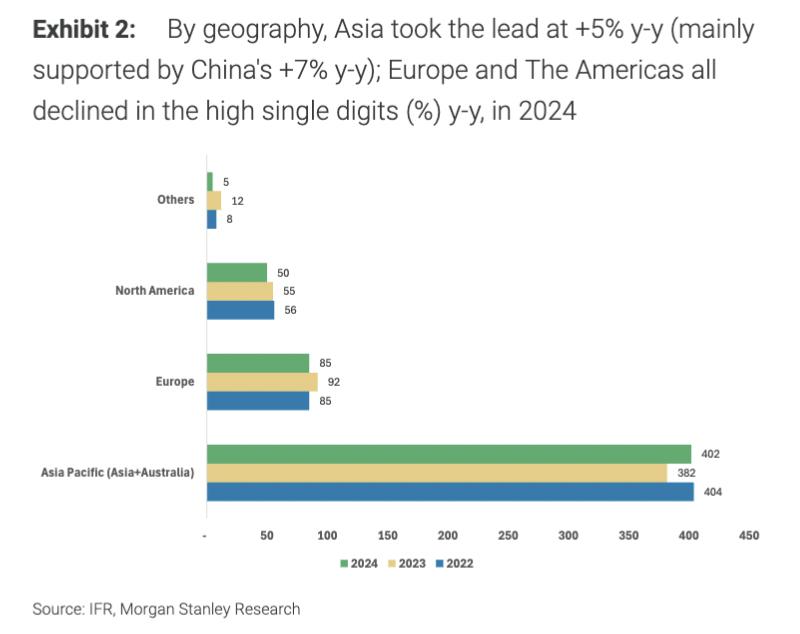 根据国际机器人联合会(IFR)的数据,在中国的强劲表现(同比增长 7%)带动下,包括澳大利亚在内的亚洲市场整体实现了 5% 的同比增长。相比之下,欧洲和美洲市场的安装量均出现了高个位数的同比下滑。