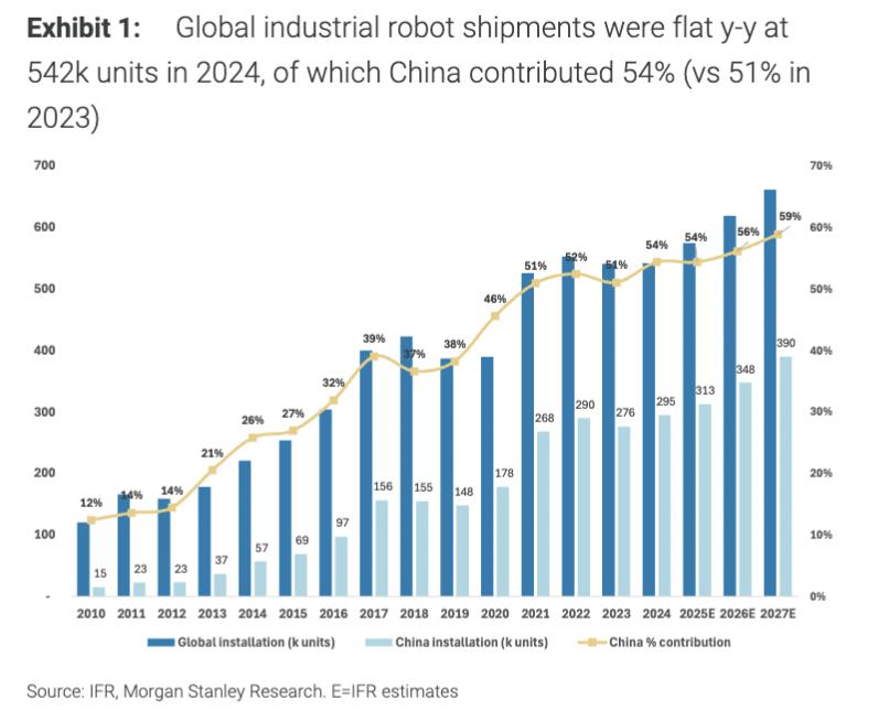 除了作为消费市场的重要性,中国在机器人生产和本土品牌建设方面也取得了显著进展。据大摩估算,目前全球约 55% 的机器人在技术上于中国生产,显示了其在全球机器人供应链中的制造核心地位。