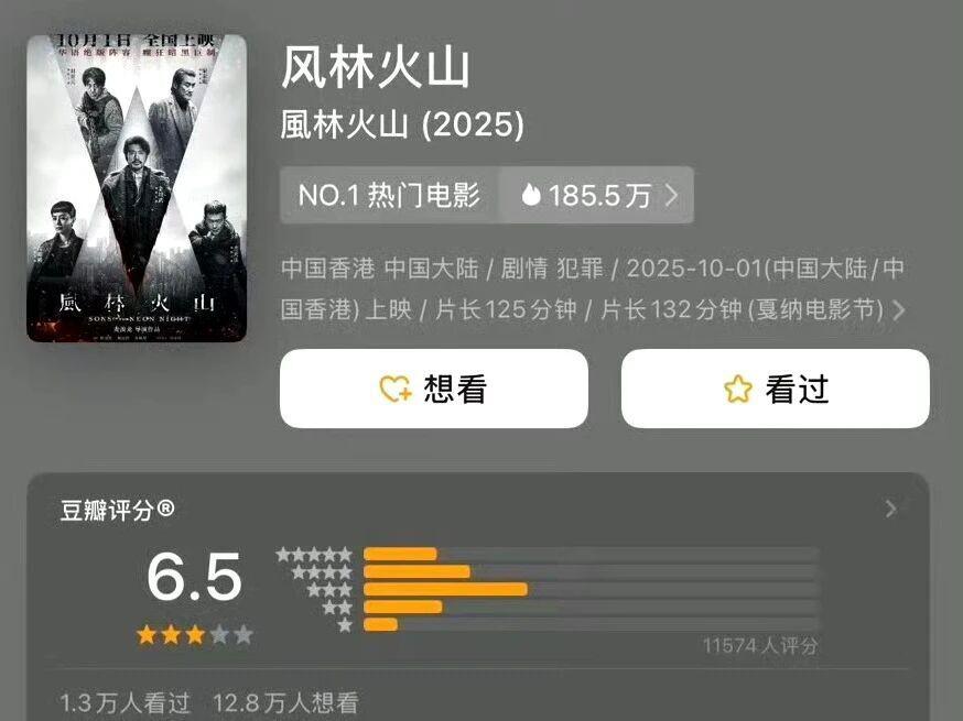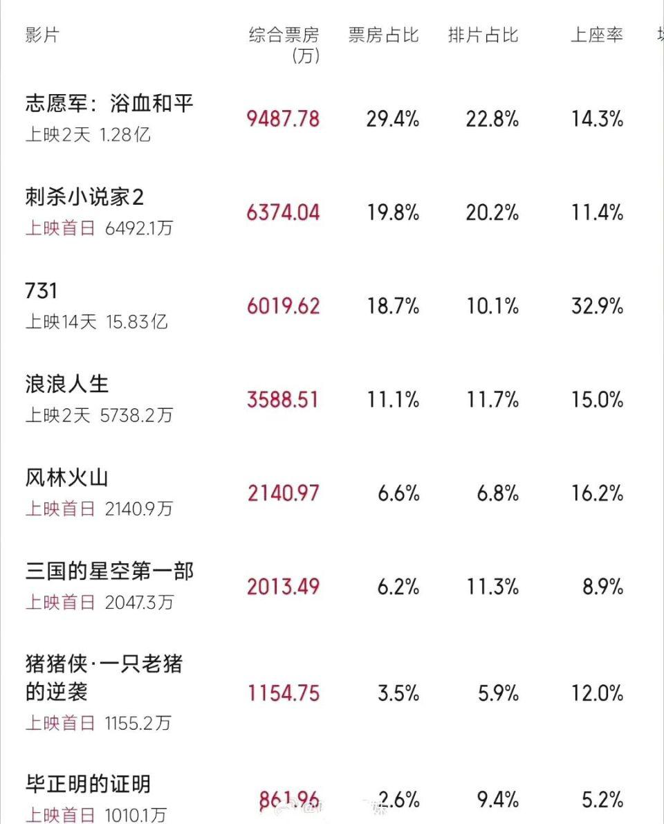 还有两点需要留意:一是《风林火山》的 " 想看人数 " 与票房反差,说明前期期待值未必能转化为观影行为;二是未开分的《三国的星空》、未正式上映的《震耳欲聋》可能后来居上。