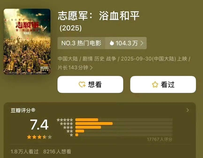 7.4 分的评分匹配了其史诗定位,票房则尽显头部实力:首日 9487 万元,迅速破亿的成绩印证了主旋律战争片的市场号召力。