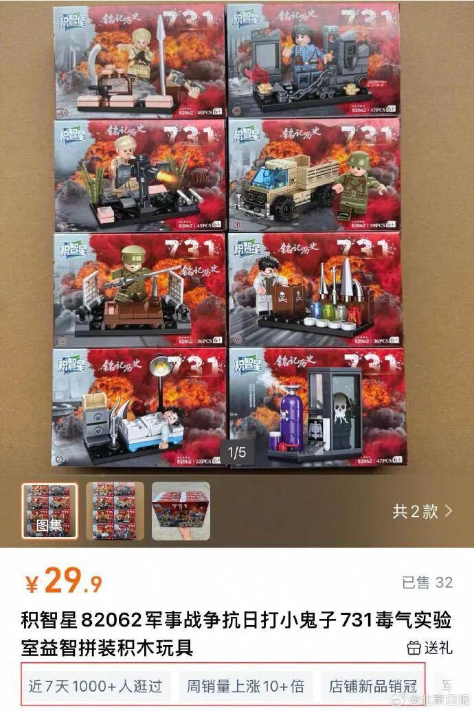 10 月 3 日 15:00,记者仍能看到相关玩具在架销售。该款玩具共有 8 小盒,包装盒上均被标注了 " 铭记历史 " 字样,还显示具有 " 爱国教育情感启蒙 "" 军事主题历史还原 " 等特色。店铺注明该款玩具适用年龄 13 岁,售价 29.9 元。平台显示 " 近 7 天 1000+ 人逛过 "" 周销量上涨 10+ 倍 ",为 " 店铺新品销冠 "。