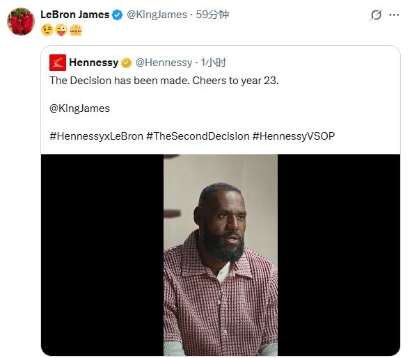 轩尼诗官方账号配文:决定已做出,为第 23 年干杯;詹姆斯转发自己的这段广告,并且配上调皮和皇冠的表情。