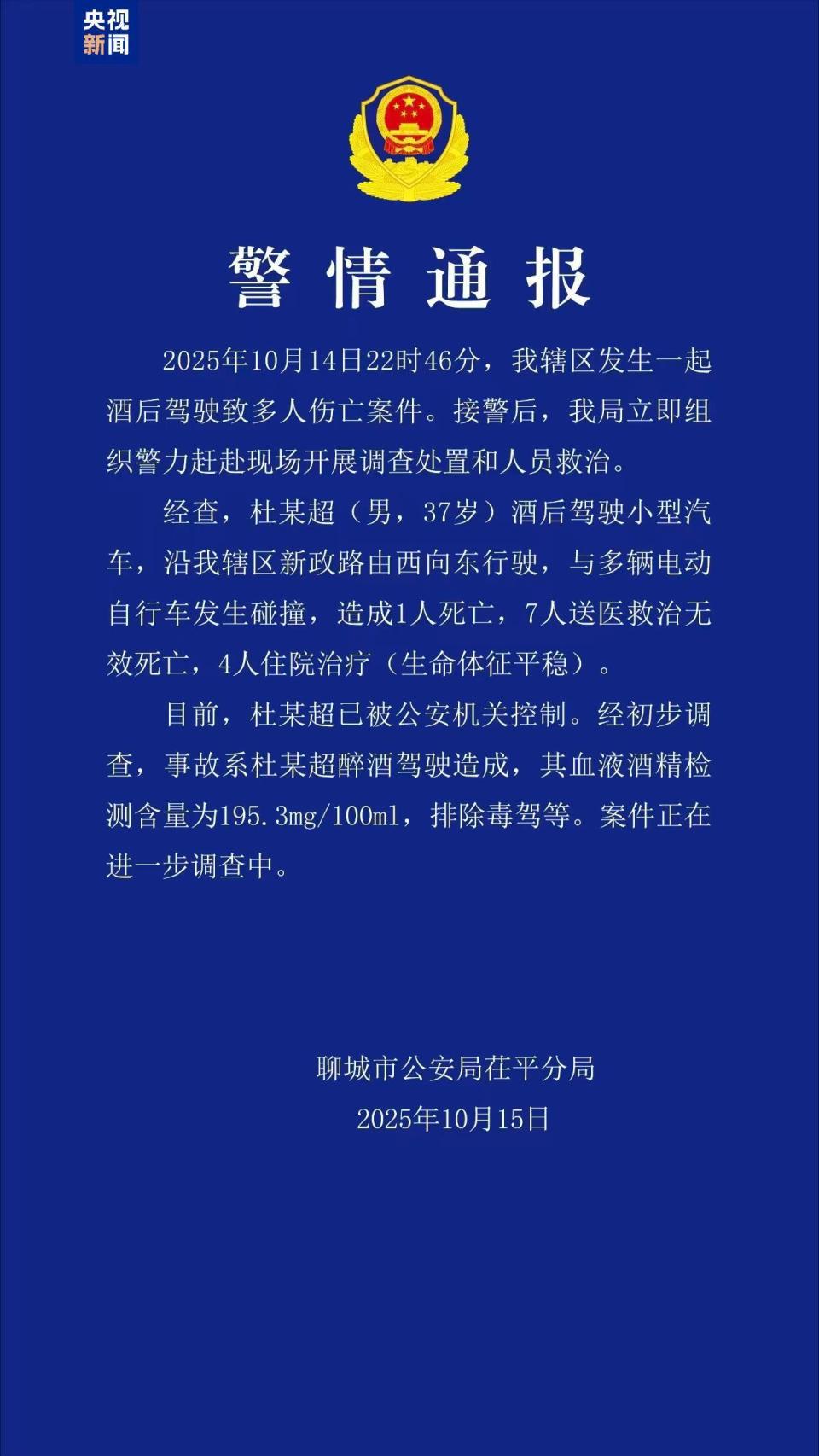 今天,山东聊城公安局茌平分局发布警情通报:10 月 14 日 22 时 46 分,辖区发生一起酒后驾驶致多人伤亡案件。经查,杜某超(男,37 岁)酒后驾驶小型汽车,沿辖区新政路由西向东行驶,与多辆电动自行车发生碰撞,造成 1 人死亡,7 人送医救治无效死亡,4 人住院治疗(生命体征平稳)。