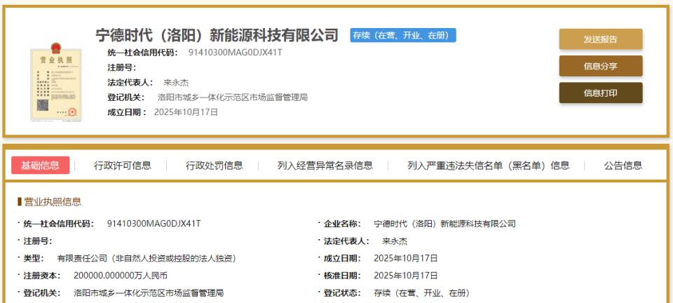 10 月 20 日,大河财立方记者查询国家企业信用信息公示系统发现,宁德时代(洛阳)新能源科技有限公司于 10 月 17 日成立,注册资本 20 亿元,法定代表人为来永杰,经营范围包括电池制造、电池销售、新兴能源技术研发、新材料技术研发等。