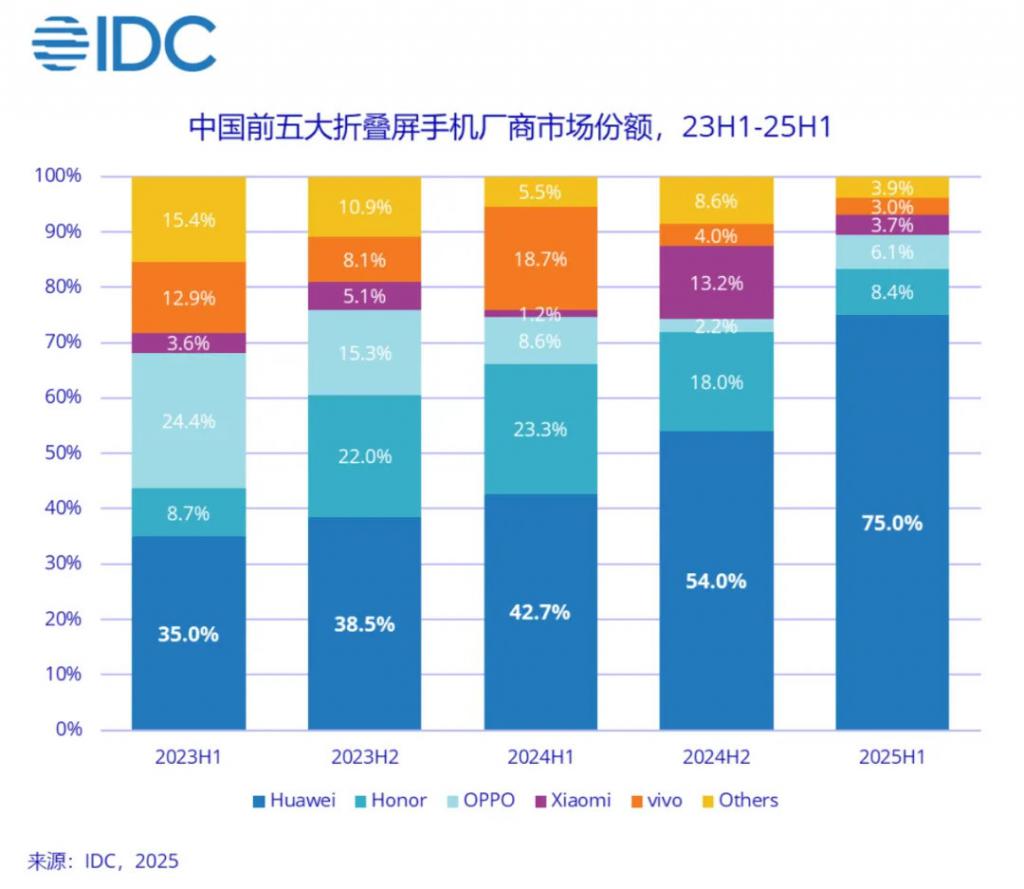2025 年上半年,华为折叠屏出货量达 374 万台,占据中国折叠屏市场 75% 的份额,创下历史新高。截至 2025 年,华为折叠屏手机在国内市场份额甚至超过 65%。