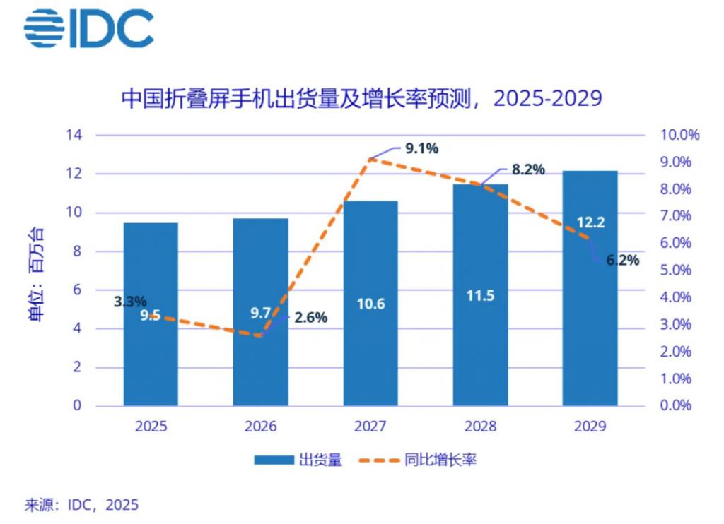 距离第一批折叠屏手机上市已过去六年,技术瓶颈仍难以突破。IDC 预计,到 2029 年全球折叠屏手机出货量将接近 2729 万台,五年复合增长率仅 7.8% ——远低于行业早期的乐观预测。