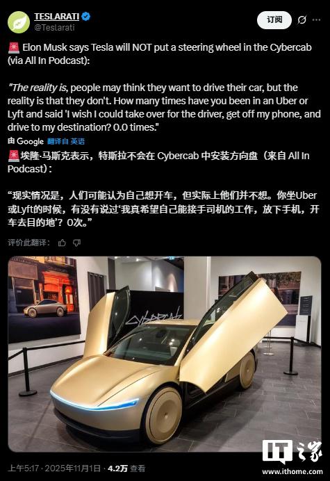 IT 之家 11 月 2 日消息,特斯拉 Cybercab 是一款以自动驾驶为核心的汽车,然而近期外界对于该车型的配置产生了诸多猜测,尤其是其是否将配备传统的方向盘和踏板。