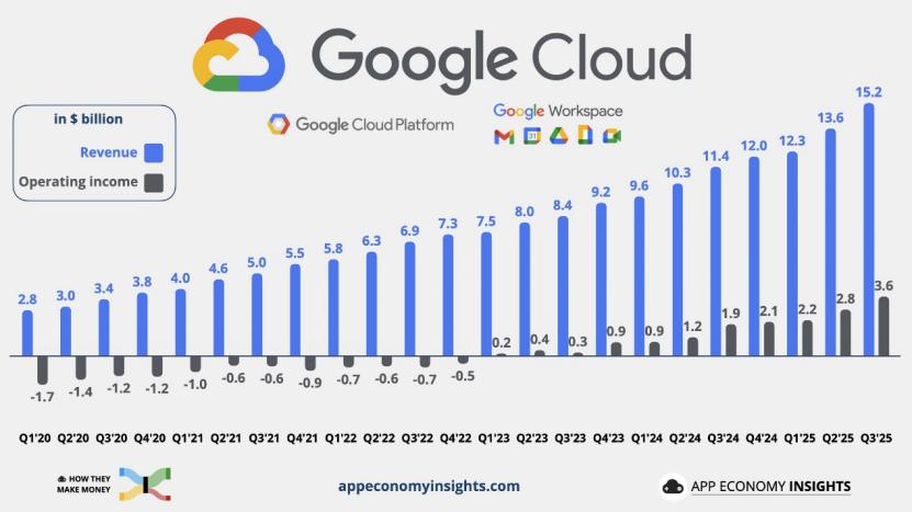 图注:谷歌云 2020 年 -2025 年三季度的营收与盈利贡献趋势图