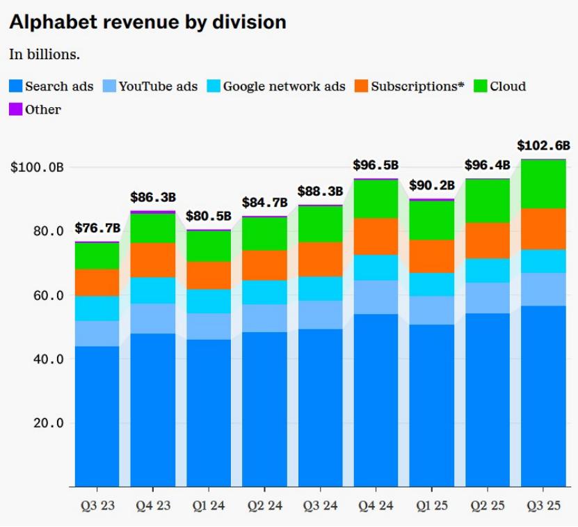 图注:谷歌 2023 年三季度 -2025 年三季度分部门营收