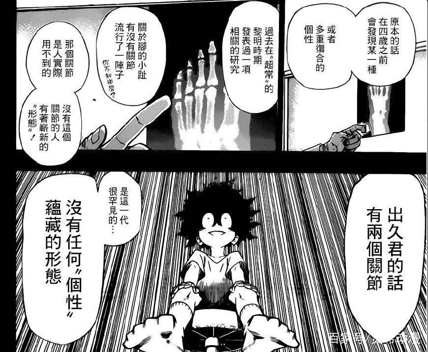 个性的发现,普遍都在4岁以前。根据相关研究,可以通过X光片看小脚趾的关节,关节脚趾退化的预示着会有个性的产生,而绿谷的脚趾却没有退化的迹象。被医生判定为罕见的:无个性。