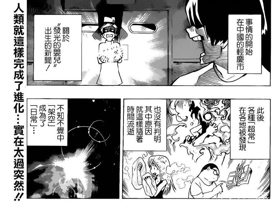 在开篇时作者已简单的告诉大家“个性”的来历:最初,从中国的轻庆市出现了会发光的婴儿,之后在全国各地陆续出现了拥有“超常能力” 的新生儿。随着时间的推移,占世界上80%的人口都觉醒了“个性”而对于个性产生的原因,作者用“没有判明原因”一笔带过。可能对于堀越耕平老师来说强行给一个解释,还不如不解释。这让我想起了《寄生兽》中的寄生袍子也是凭空出现,画作者没有做任何解释。