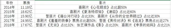 2014年国庆档票房累计11.18亿,喜剧片《心花路放》就收获6.48亿票房,占比超50%;2015年国庆档票房累计18.62亿票房,喜剧片《夏洛特烦恼》收获5.6亿票房,另一部喜剧片《港囧》收获5.5亿票房,两部喜剧片票房累计占比近60%;2016年国庆档票房累计15.9亿票房,博纳出品警匪片《湄公河行动》票房5.32亿,占比33%,喜剧爱情片《从你的全世界路过》票房4.67亿,占比近30%;2017年国庆档票房累计26.55亿,喜剧片《羞羞的铁拳》收获13.46亿,占比超50%。警匪片《英伦对决》和《追龙》分别收获3.73亿和3.59亿票房,占比近27%;2018年国庆档票房累计19.08亿,警匪片《无双》收获6.29亿票房,占比32%,张艺谋作品《影》收获3.87亿票房占比20%,喜剧片《李茶的姑妈》收获4.09亿票房,占比21%。