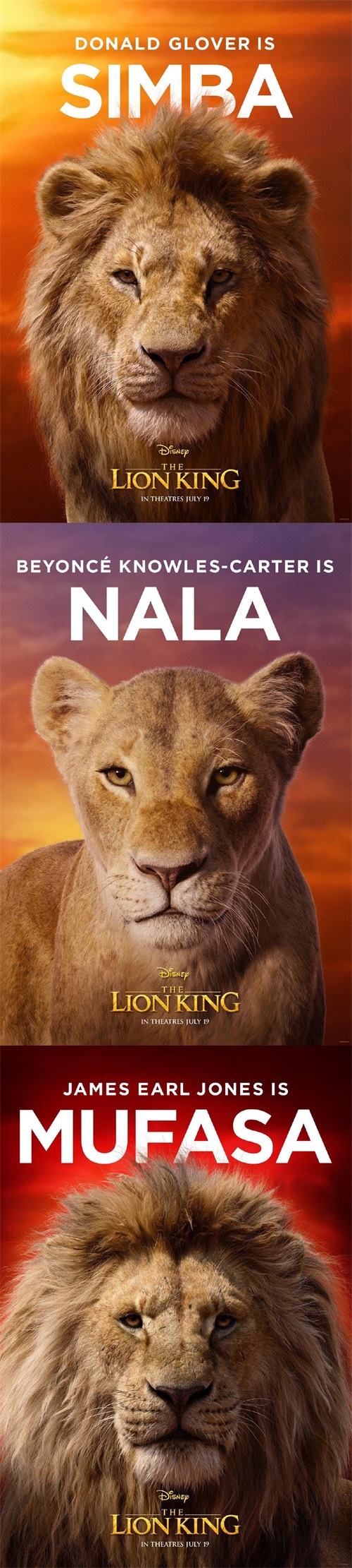 迪士尼真人CG电影版《狮子王》发布角色海报。大小辛巴、大小娜娜、狮王木法沙、王后沙拉碧、刀疤叔叔、彭彭与丁满、山魈拉菲奇、犀鸟沙祖全员现身。影片已定档7月19日北美上映,希望同步。