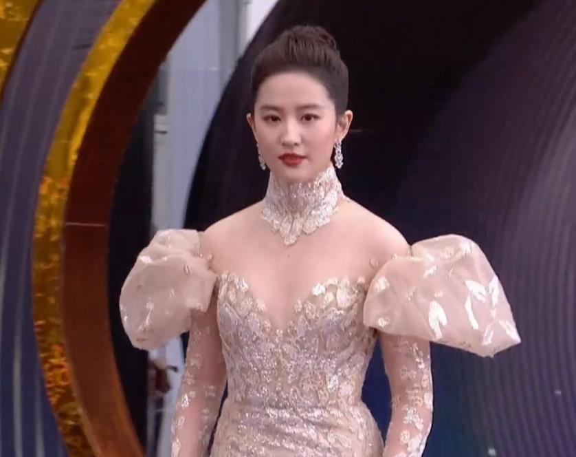 工作室出图中的刘亦菲一袭肤色长裙,脖子上是繁复的刺绣设计,再加上超大的泡泡袖,配上刘亦菲精致的五官,仿佛中世纪古堡中走出来的公主。