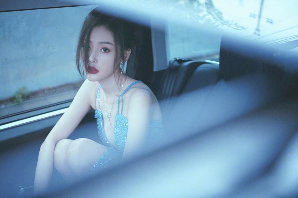 一身蓝色亮片深V礼裙,直角肩天鹅颈气质绝佳,配上精致美艳的五官,无论怎么拍都像是精修图一样。工作室的每一张出图,也都拍得极有故事感。