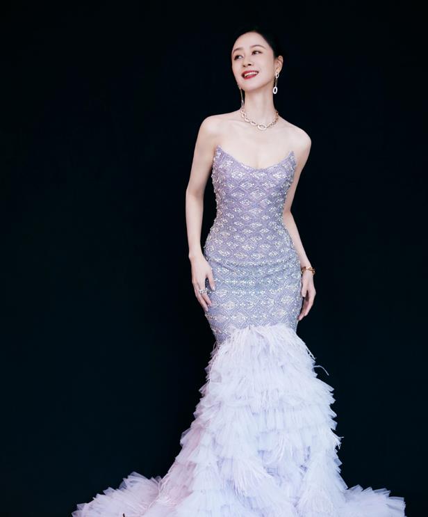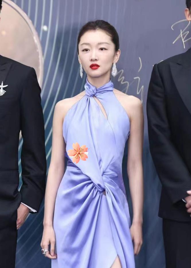 周冬雨的身材纤细单薄,但非常适合这种贴身型的紫色绸缎礼服,搭配贵重珠宝,整体观感是优雅简约,气质原地飞升。
