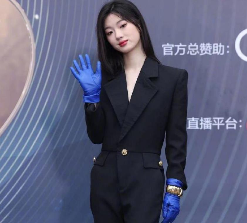 不过红毯这身红毯造型多少有点看不懂,很明显小姑娘走的是酷帅风,黑色西装十分帅气,让人迷惑的是这副蓝色手套,有种家务做到一半被临时拉来走红毯的既视感。