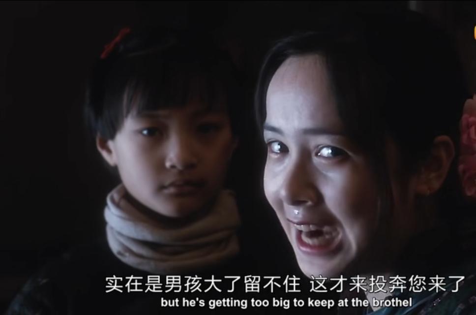电影里回忆中的第一场戏,作为主角的童年程蝶衣和母亲最先出现在镜头中。