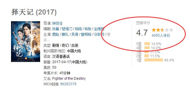 随着《人民的名义》持续爆火,另外一部剧《择天记》却是反其道而行,《择天记》靠的就是流量小生的关注度,没想到事实还是不容置疑,小鲜肉的演技还是缺火候。同时小编看了这部剧的豆瓣评分只有4.7分,而且评分人数也不少,但是口碑真的不怎么样。