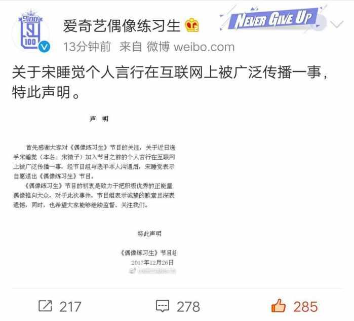 网络真人秀综艺节目《偶像练习生》,再爆出冷门事件。今晚10点,官方微博正式发布声明:宋睡觉选手自愿退出《偶像练习生》的比赛。