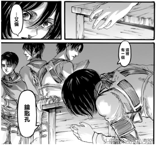 此时三笠发现一个不起眼的钥匙孔,艾伦用钥匙尝试了一下,居然打开了,原来这把钥匙并不是地下室的门钥匙,而是用来开这个抽屉的。