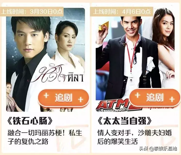 从3月23日起,每周上线一部泰剧,分别是《丘比特的圈套》《铁石心肠》《太太当自强》《麻雀变凤凰》《爱在旅途》等。