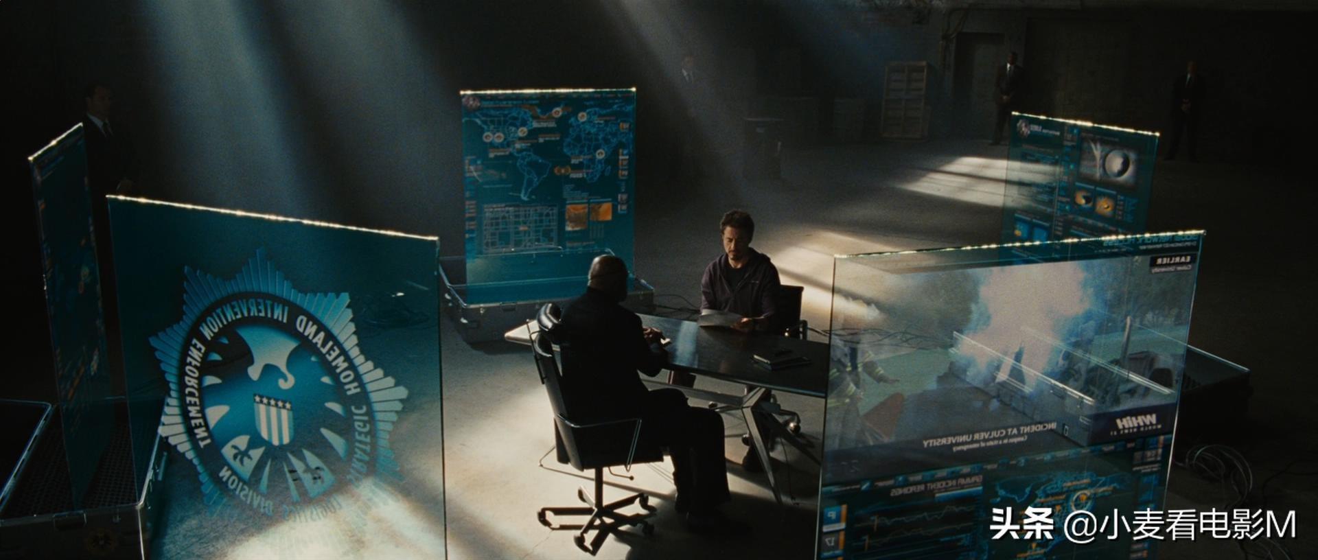 电影结尾神盾局长和托尼商谈复仇者联盟计划,旁边电视屏幕暗示几个剧情正在同时发生,分别是: