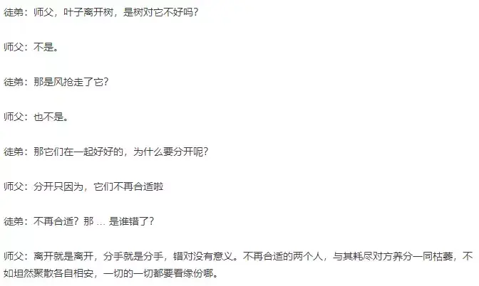 视频内容则是老和尚与小和尚围绕“天长地久”、“爱”、“分手”等问题的谈话。其中有一段或许可以看成琼瑶对林婉珍指控的回应: