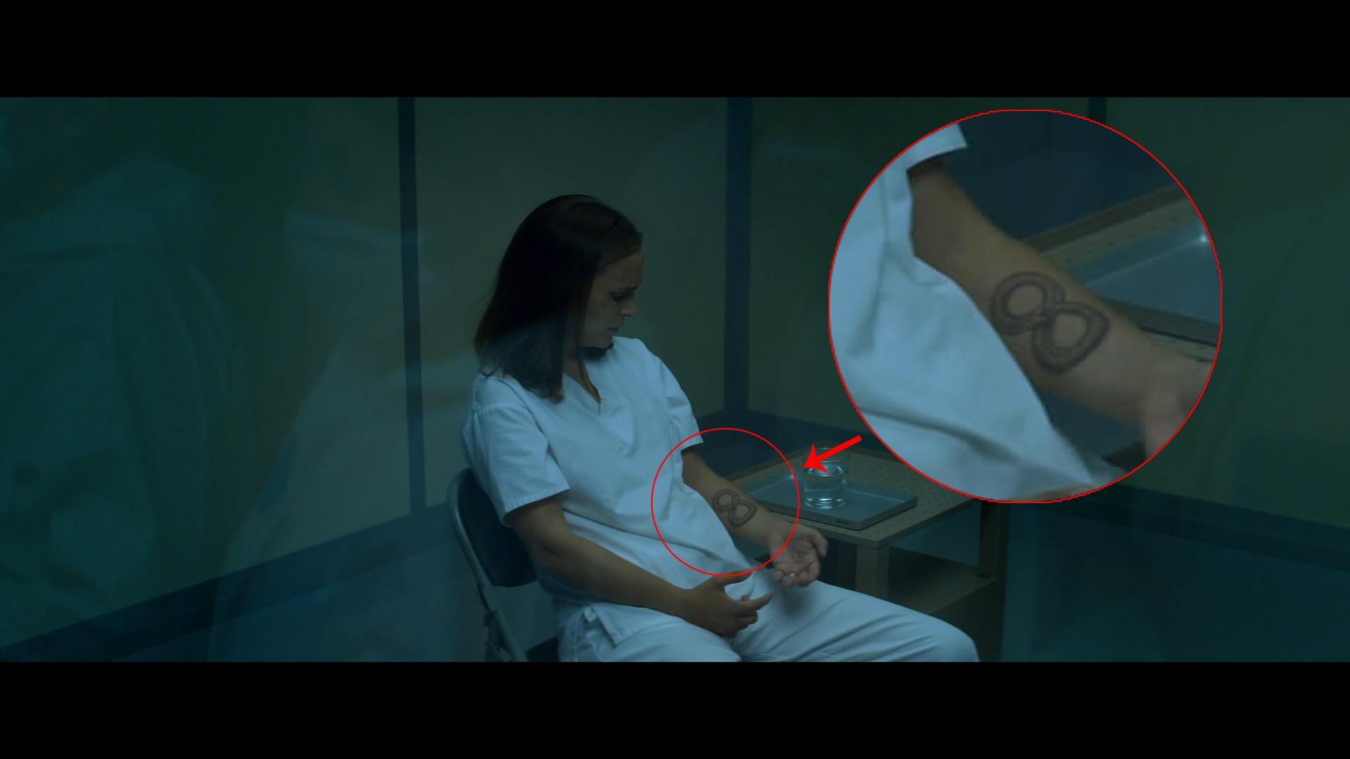 阿玛亚堡的泳池壁上的那具尸体,也就是那个肠子会动的人的手臂上有这样一个纹身。按照正常的时间顺序而不是电影播放的顺序,这是这个纹身第一次出现。但是在这之后的一段时间当中,莉娜的手臂上也没有出现纹身。