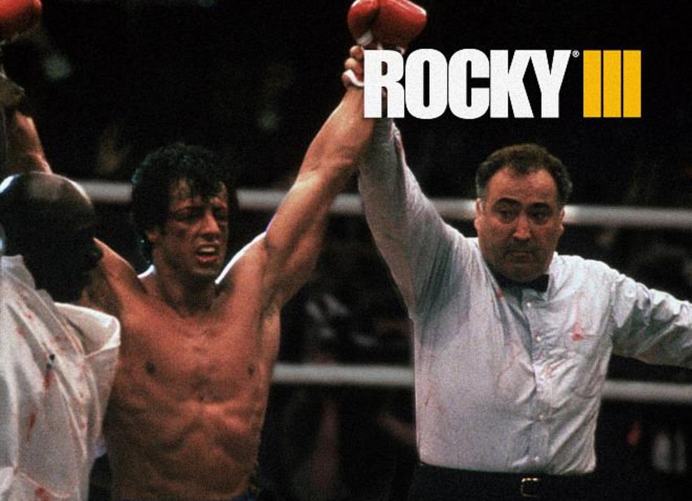《洛奇3》,该片于1982年上映,该片主要讲述的是在第二次击败宿敌——黑人拳王阿波罗·克里德(Carl Weathers 饰)后,当初贫民窟出身的穷小子洛奇(西尔维斯特·史泰龙 Sylvester Stallone 饰)逐渐走上事业的顶峰。他先后十次卫冕,创造了重量级拳王的不败神话,受到来此各界的疯狂追捧。原本打算引退的洛奇受到了黑人拳击手克鲁伯(Mr. T 饰)的挑战,他不顾经纪人米基(Burgess Meredith 饰)的阻拦,决然走入擂台,却遭遇了生涯中久违的惨败。在此之后,米基因心脏病去世,洛奇也陷入消沉。