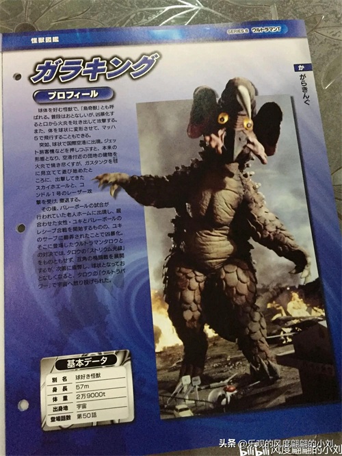 爱球怪兽·嘎拉王,喜好球类的宇宙怪兽,有着【鸟奇兽】的别名。平时还比较老实,但在凶暴化之后就会喷出火焰四处攻击。嘎拉王的来历不明,有一天突然以球形状态来到地球的国际机场之中,因厌恶喷气机引擎的声音而摧毁了数架飞机后,变回原本的怪兽姿态,还用火焰彻底焚毁了机场,随后入侵市区。