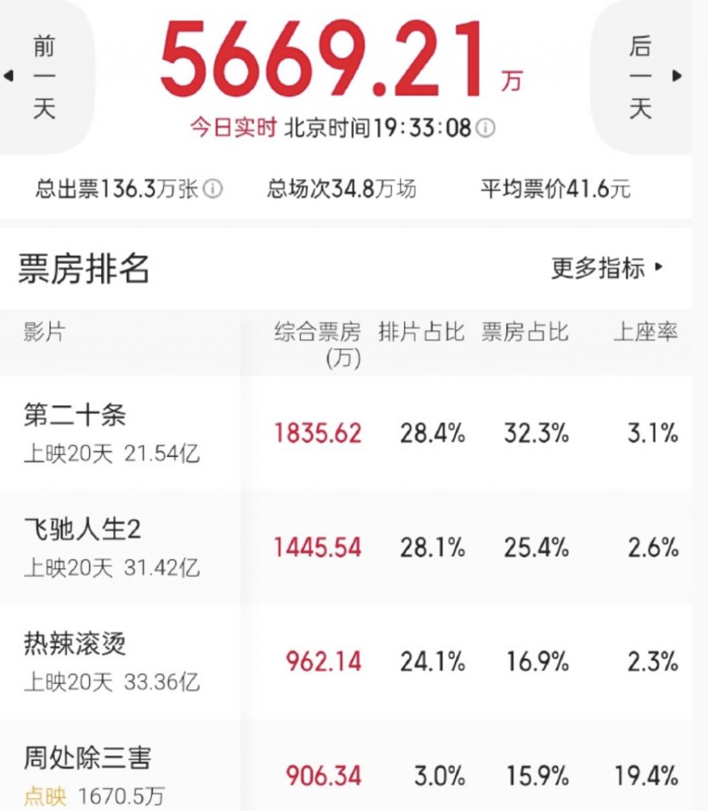 一方面 " 换盘风波 " 导致了许多影院排片混乱,另一方面,它又如影片的内容一样,首映当日排行第三,第二日 " 干掉 " 了榜二大哥,第三日 " 干掉 " 了榜一,一骑绝尘 ……