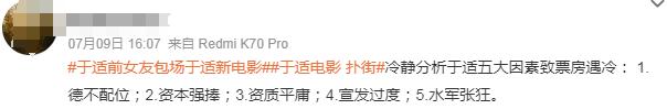 我非常认同一部电影市场反馈不好是多方面的原因,单纯甩锅给于适一人不扛票房的说法有些片面,但于适粉丝总结的扑街原因未免过于荒诞,包括但不限于以下: