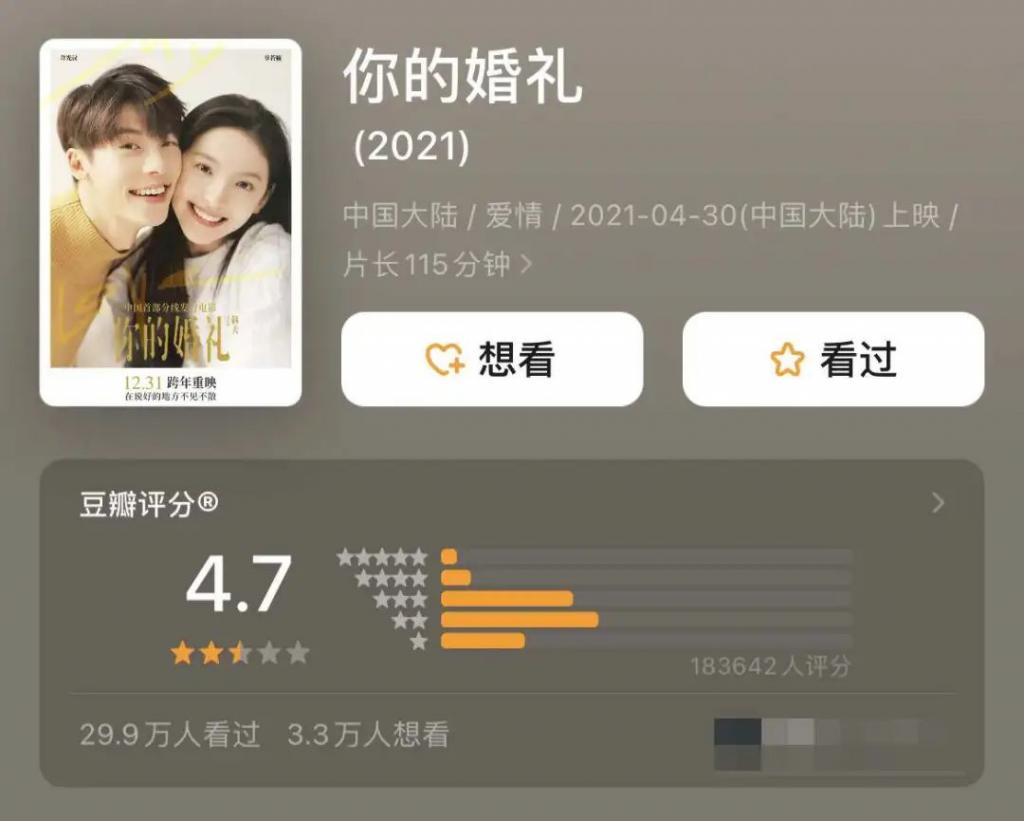 事实上,《你的婚礼》不是第一部低分重映且赚足票房的国产爱情片。