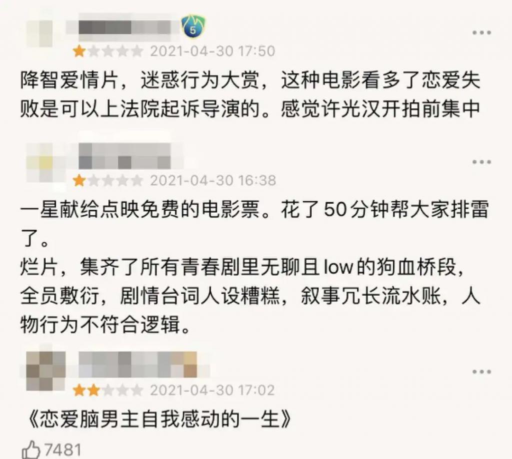 2021 年上映时,观众的吐槽就如洪水般汹涌。就算有许光汉和章若楠的双双高颜值,大家也看不下去: