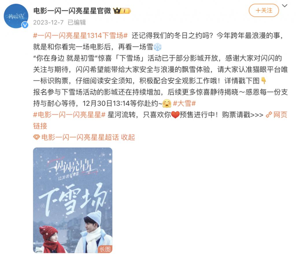 电影《亮星星》也借势营销,很早就宣布电影会有下雪场——放映结束后,影院会模拟下雪,飘起 " 雪花 "。