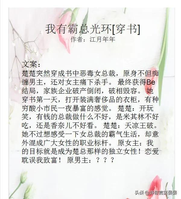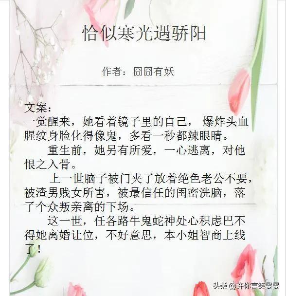 这部小说算重生文,女主重生以后,开挂了!中间有一段男主消失(也不算,就是男主文笔不多)但无伤大雅,全文依旧透着男女主对双方的眷恋,真的很好看。