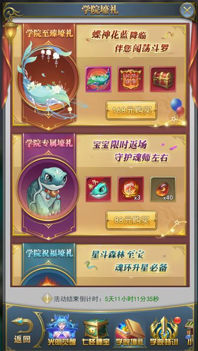 活动期间,将开启光明觉醒、七怪秘宝、学院壕礼、学院特训、小卖部、限时置换、社团福利、新生手册、魂环兑换等多项活动内容.
